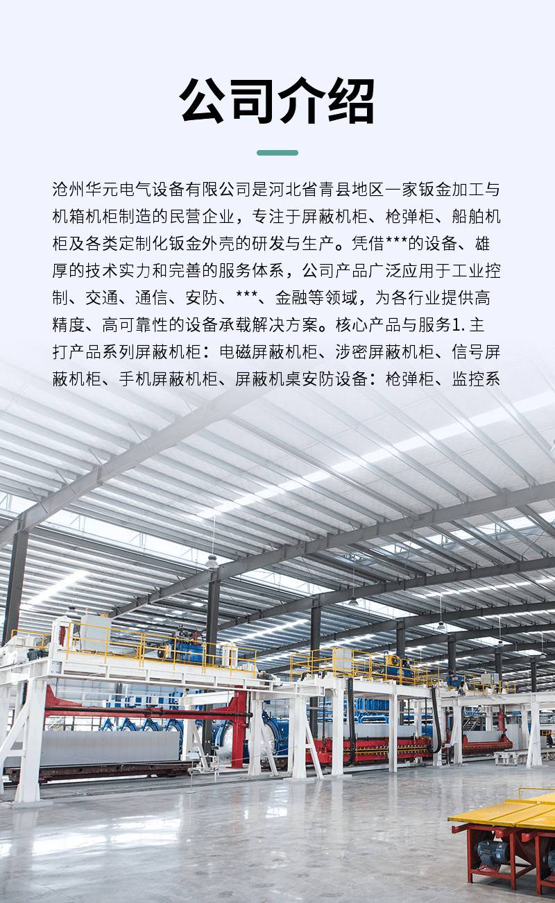 | 公司简介 | 沧州华元电气设备有限公司是河北省青县地区一家钣金加工与机箱机柜制造的民营企业,专注于屏蔽机柜、枪弹柜、船舶机柜及各类定制化钣金外壳的研发与生产。凭借先进的设备、雄厚的技术实力和完善的服务体系,公司产品广泛应用于工业控制、交通、通信、安防、国防、金融等领域,为各行业提供高精度、高可靠性的设备承载解决方案。核心产品与服务1.主打产品系列屏蔽机柜:电磁屏蔽机柜、涉密屏蔽机柜、信号屏蔽机柜、手机屏蔽机柜、 ... | ||